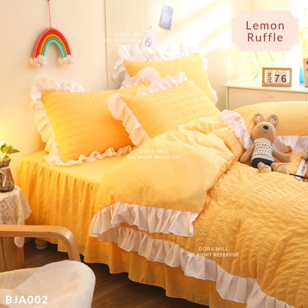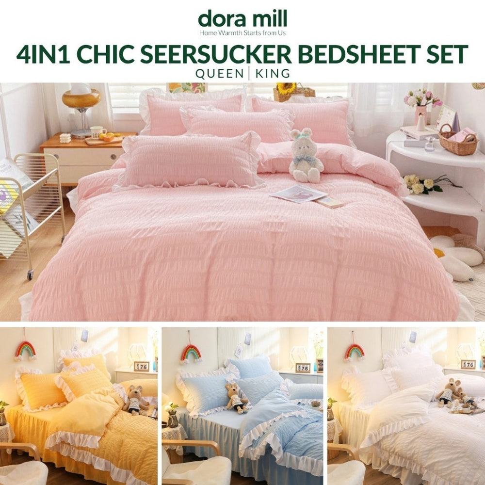Bring a soft, romantic flair to your bedroom with the Dora Mill Seersucker Bed Skirt Quilt Cover Bedsheet Set – designed for those who appreciate elegance with a touch of texture.